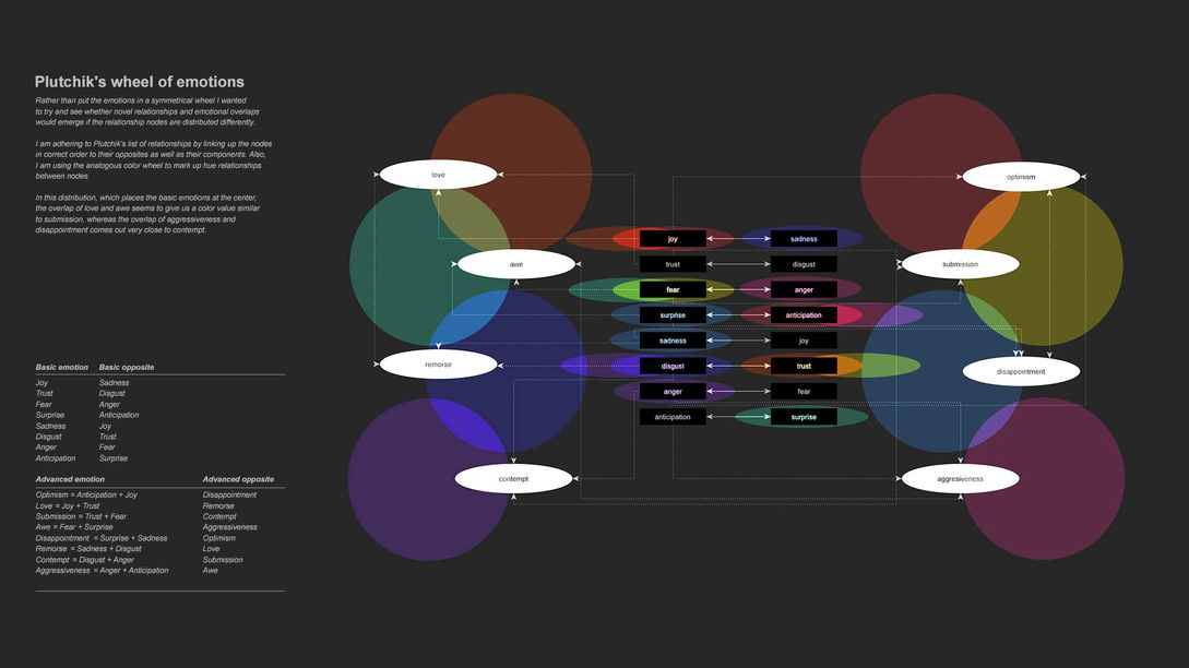 Rather than put the emotions in the original symmetrical wheel I wanted to try and see whether novel relationships and emotional overlaps would emerge if the relationship nodes are distributed differently. A confused, contradictory psychological landscape in other words, that would give psychologists something to chew over and get their heads around. However, I did adhere to Plutchik’s list of relationships by linking up the nodes in the correct order to their opposites as well as their components. Also, I used the analogous color wheel to mark up hue relationships between nodes. To this end I initially created a series of diagrams in which the nodes were distributed randomly by the software of the graph editor.