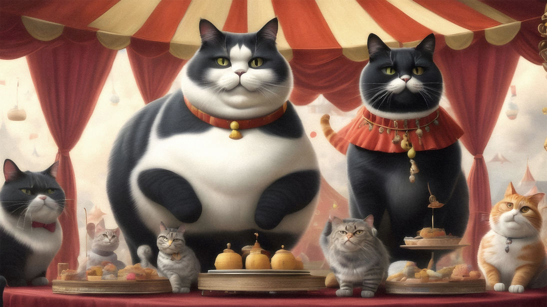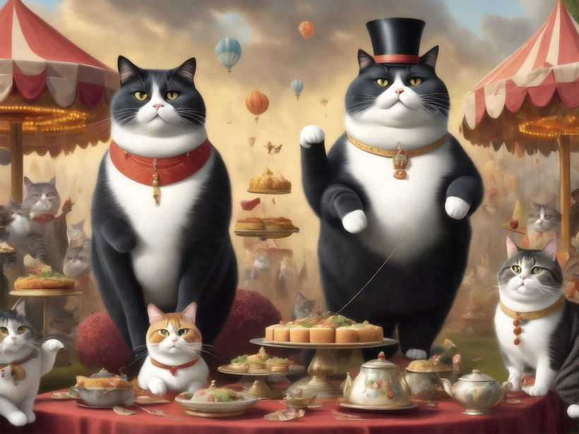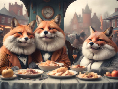 Prompt: soft misty vintage portrait of [fat cats / sleek foxes] having a lavish meal. (((the face of the cats especially the whiskers nose and mouth is very softly rendered with tones blending into each other as very soft gradients creating high detail that is still very soft))). the eyes are highly detailed. in the background is a vintage fairground with a red and cream striped circus tent. high horizon. the autumn weather is overcast with a grey sky with thick black clouds.